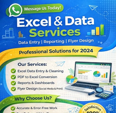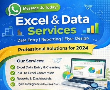 We provide reliable Excel and Data services including data entry, cleaning, reporting, dashboards and basic data analysis. Fast delivery and accurate work